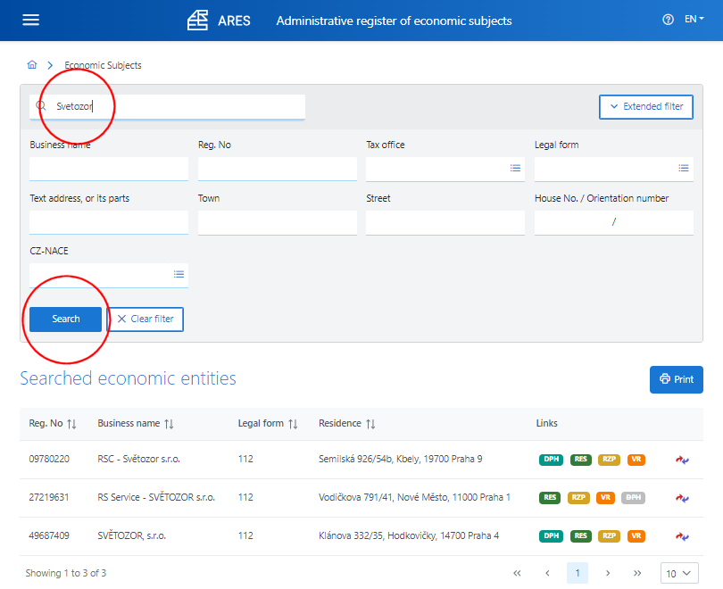 If you are looking for data on a Czech business, look it up in the ARES system.Start by changing the language to English in the right top corner and select 'Economic Subjects'. It will lead you to a next page.